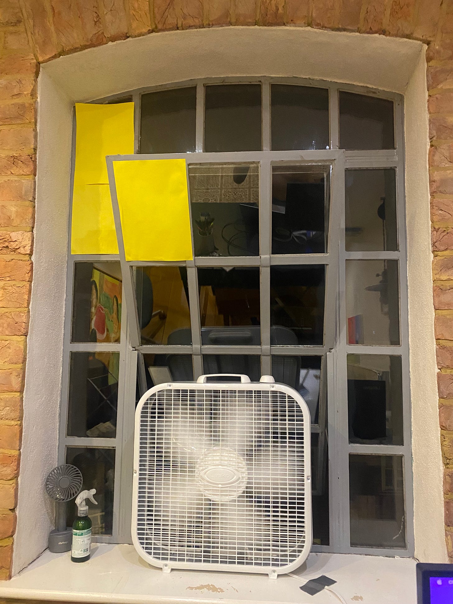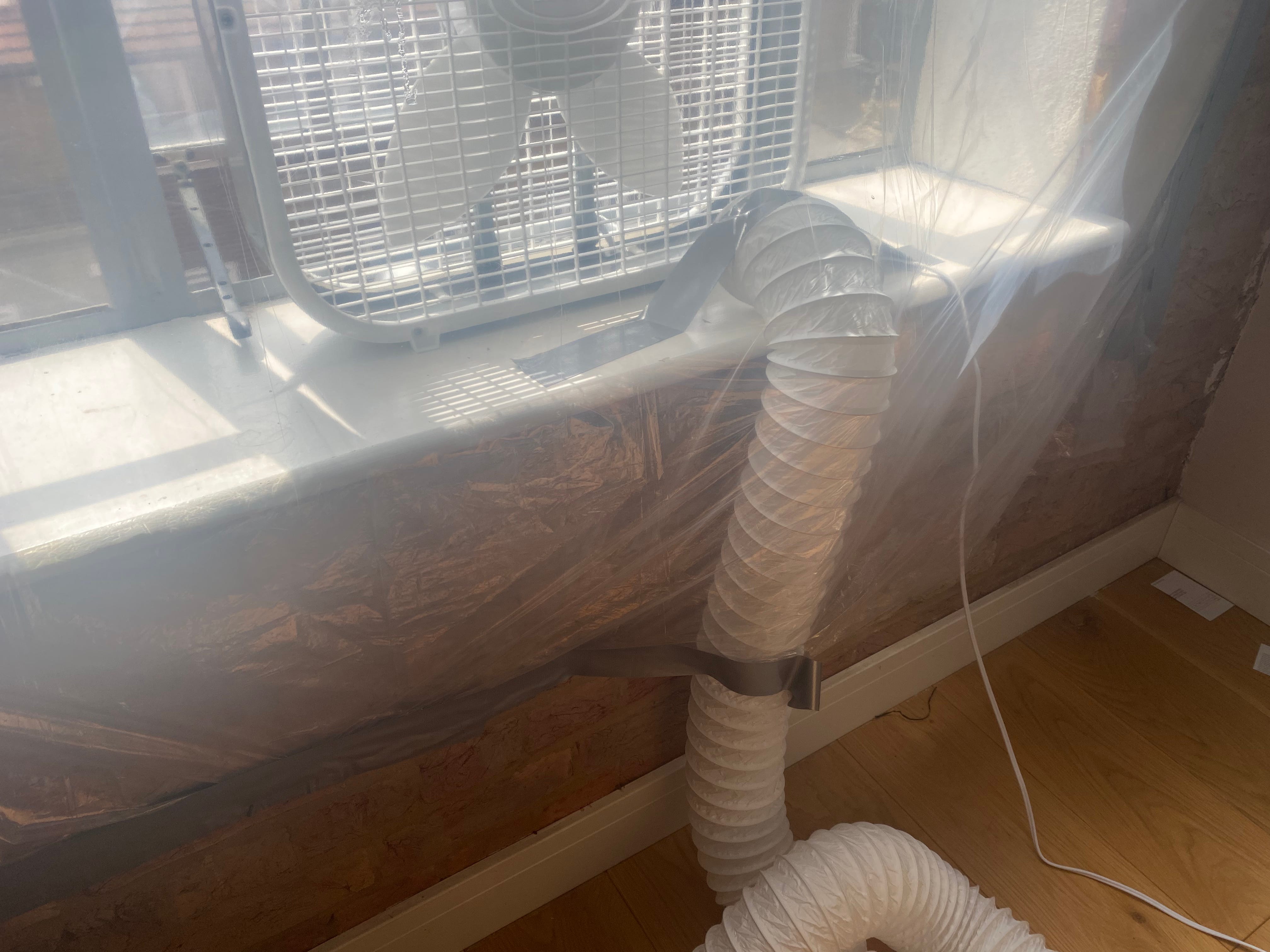 Afiq's window is 1.45m by 1.7m, made of glass and opens in an annoying way. The general idea is to seal it somehow, then have an inlet where we can filter in clean air through either a box fan or a duct fan via HEPA filter.