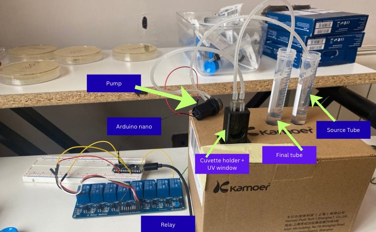 To do this, I have a source tube with the solution that I want to irradiate. A pump, which is connected to a relay, pumps it into a cuvette. The cuvette holder has a window where I can shine a different UV lights into it. The pump then finally moves it into the final tube.