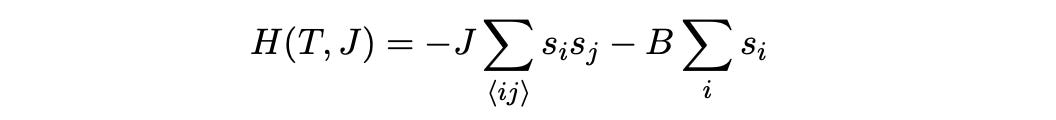 Since each atom has spin, we may want to penalize the configurations where nearby atoms have opposing spin. Philosophically, what we are doing here is coming up with a model that penalizes disorder. So we should develop an energy penalty for when a particular configuration has a mix of up spins and down spins. One such model is the Hamiltonian shown below.