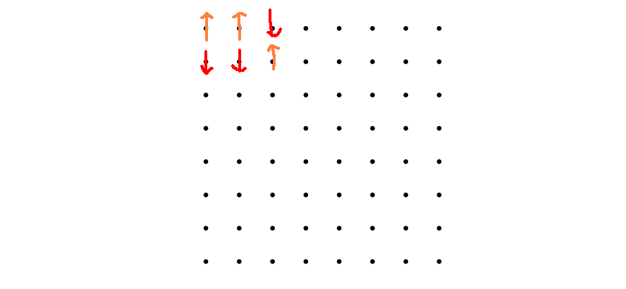 Suppose that we have a grid of 64 equally spaced atoms on a grid shown in the figure below. Suppose that each of these atoms has a property associated with them — like a 'spin' orientation for each one. At this moment, 'spin' will be an abstract concept to capture the orientation of an atom, and for now, it has no real physical meaning other than to quantify how disordered a system is rigorous. We could have labelled these things apple and orange, for all I care. For simplicity, let's just imagine we only have two types — an up spin or a down spin — and we chose any configuration we want, like in the diagram below.