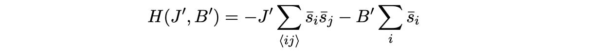 And guess what — we can assign precisely the same types of physical quantities and models on this zoomed-out model, just like we did before! However, instead of penalizing spin differences on the individual spins of each atom, we now penalize the spin differences of the groups themselves. Let's assume for now that the form of our energy is the same, but perhaps with different coupling constants, J' and B'.
