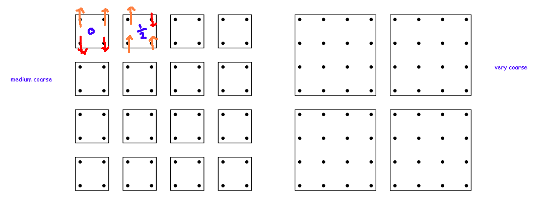 This is shown in the first diagram. First, we've grouped atoms into sets of four, then we assign a single amalgamated value (the average spin) to each group of four atoms. So now, we've reduced the problem to a zoomed-out problem of only 16 points instead of 64. We can make this reduction because there are currently 16 locations with a combined spin.