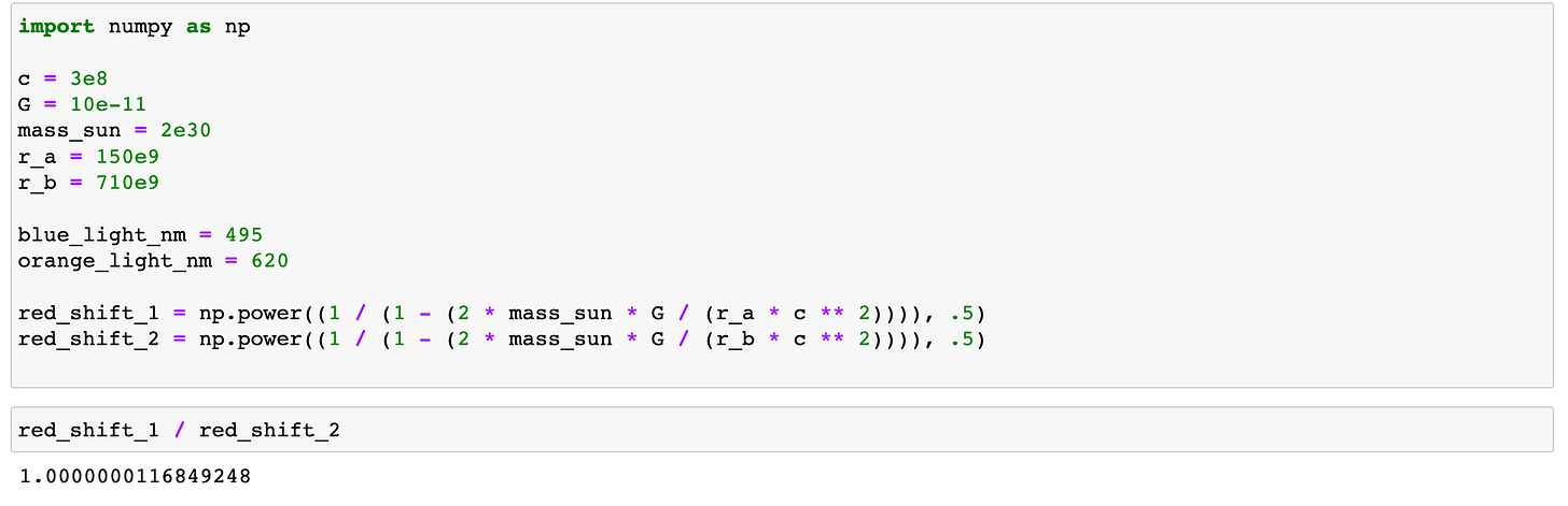 It is often useful to get a sense of the scale of this effect. We can use this relationship to calculate what our sun might look like for objects that are far away from us. What would the colour of the Earth look like for us on the next star? In the code below, I put together some values that reflect the mass of the sun, as well as the fundamental constants required in the calculation. As you can see, the effect from stars comparable to our sun is insanely small.