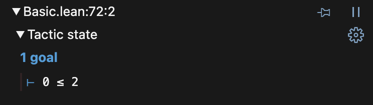 Once we do this, LEAN automatically recognises that the pattern of our goal matches the theorem - since 0 ≤ 2 matches 0 ≤ a. And so, it realises to set a = 2, so therefore progress is made. But are we done? Not quite!