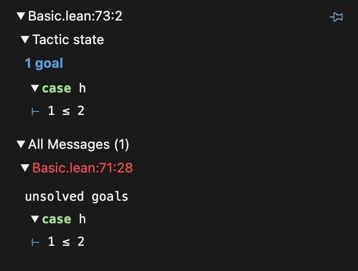 Remember that in zero_leq_n,there is an additional hypothesis (h : 1 ≤ a) that has to be true. Since LEAN has set a = 2, it then asks us to prove the subgoal of 1 ≤ 2 that’s required. This creation of subgoals is super convenient in keeping track of things - all one has to do is just focus on solving goals till the end.