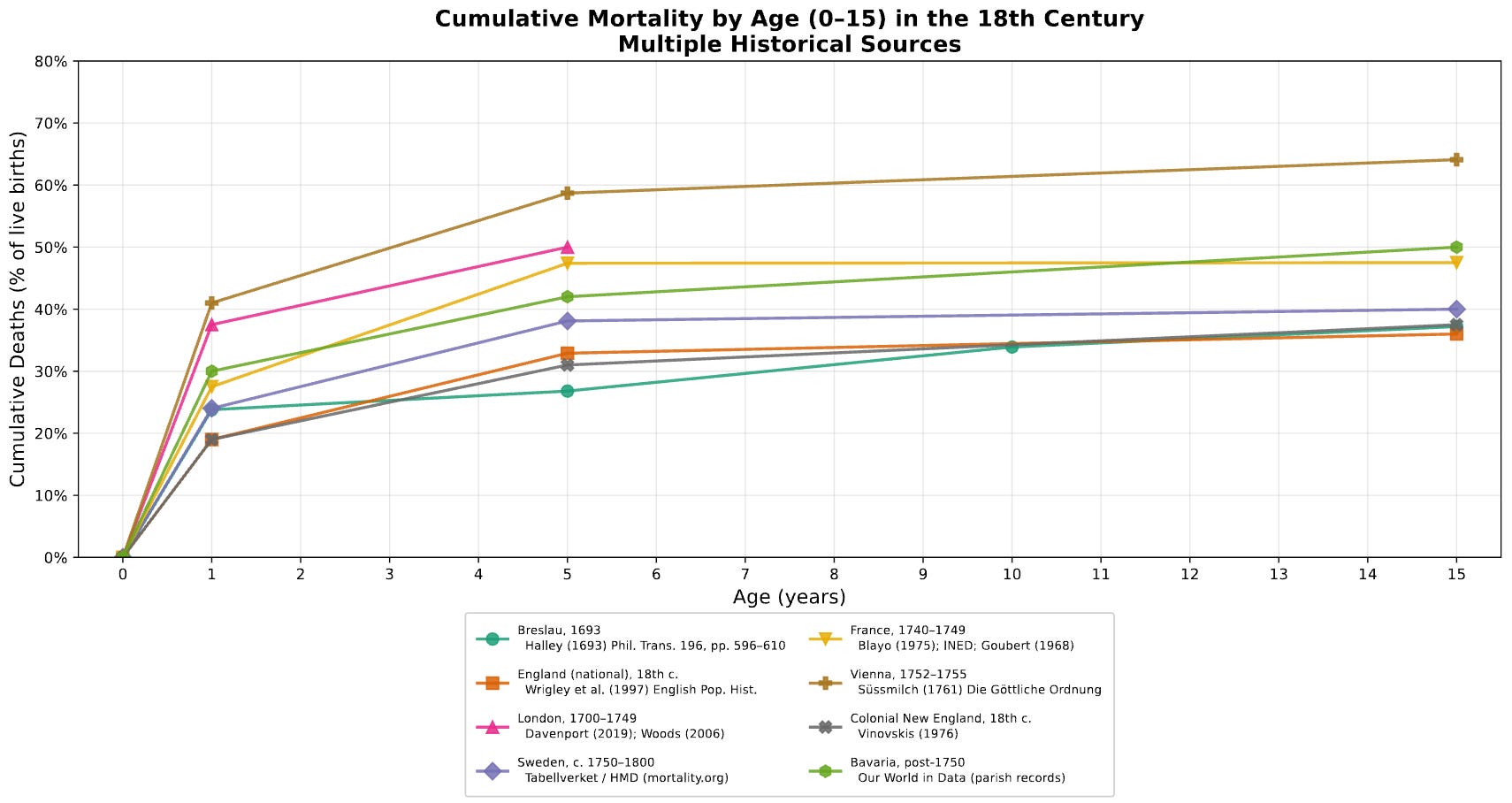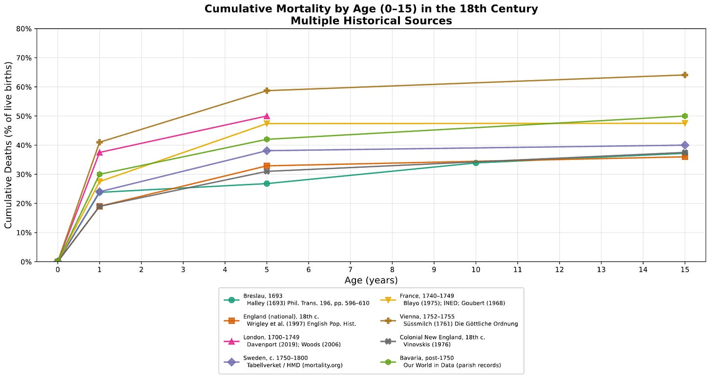 Again, even more shocking - check out this aggregated diagram of how many deaths there were in the 1700s as a function of age. I left my Claude code running to collect some data on death rates from the little records there are (mostly European parish records) on child mortality and made a plot. I got these mostly from the literature. Simply put, you had a coin toss’s chance of living after five years old at the time. But the real number is likely to be a lot higher due to reporting bias, and the dispersion in the data is also likely a function of that.